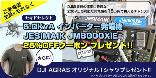 農業用ドローンの導入やより大きな規模での運用をお考えの方にお集まりいただく本イベントでは、参加特典として JM6000XiE を25%OFFの149,925円でお求めいただけるクーポンをもれなくプレゼントいたします。ドローン購入等のクーポン利用条件はありませんので、発電機の導入をお考えの方は、ぜひこの機会にご参加ください。