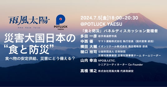 「都市と地方をかきまぜる」をミッションとする株式会社雨風太陽(本社:岩手県花巻市、代表取締役:高橋 博之、証券コード:5616、以下「当社」)は、地域経済創発プロジェクト「POTLUCK YAESU」とともに、2024年7月5日(金)に”食と防災”を考えるイベント「災害大国日本の“食と防災” 食べ物の安定供給、災害にどう備える?」を開催します。本イベントでは、”食と防災”をテーマに、有識者を招いたパネルディスカッションを実施するほか、生産者と消費者をつなぐ国内最大級の産直アプリ「ポケットマルシェ」の登録生産者が挑戦している、”食と防災”の取り組みを表彰するポケマルチャレンジャーアワードの表彰式を行います。