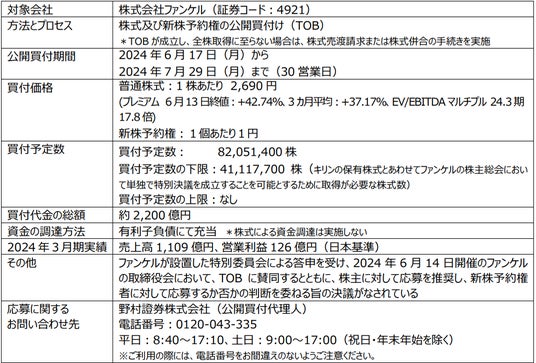 詳細は、2024年6月14日付「株式会社ファンケル株券等(証券コード4921)に対する公開買付けの開始に関するお知らせ」をご確認ください。