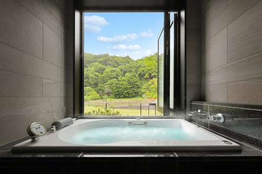 2Fには窓を開けて湯浴みが楽しめる、源泉かけ流しの半露天風呂の他、ガラス越しに上塩原の景色を望む、プライベート岩盤浴もご用意いたしました。目覚めたての朝風呂や、おやすみ前のひと風呂など、憧れのバスタイムをいつでも気軽にお楽しみください。