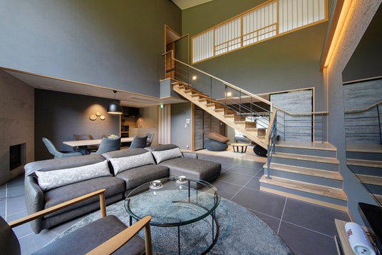 完全独立型のヴィラはメゾネットタイプで、200平方メートル の広さを誇る贅沢な間取り。落ち着いたカラーリングで統一されたリビングは吹き抜けで、2階まで届く大きな窓の向こうには箒川のせせらぎと上塩原の四季の景?が広がり、お部屋に居ながら屋外で寛ぐような解放感です。フロア奥の和室からはガラス越しにガレージに停めた愛車がショールームのようにご覧いただけます。