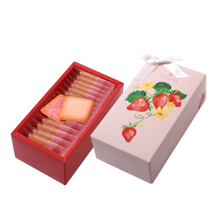 苺の香り漂うクッキー生地で苺チョコレートをサンド。甘酸っぱい美味しさが広がる軽い触感のラング・ド・シャを、春らしいパッケージに詰めました。
