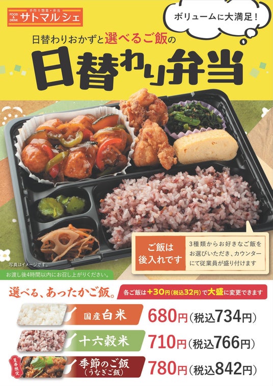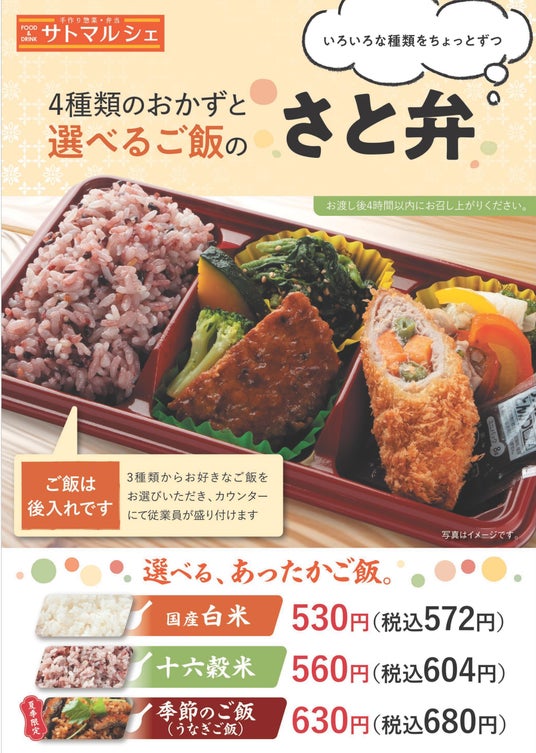 「サトマルシェ」「厨房さと」では旬の食材を盛り込んだ「季節の味覚弁当」に加え、「季節のごはん」で旬の味覚を手軽に楽しめる『選べるご飯のお弁当』を販売しております。