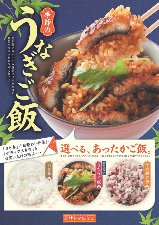 6/18(火)~8月下旬までの期間限定で、季節のごはんとして「うなぎご飯」が登場します。ふっくら焼き上げたうなぎと香ばしい特製うなぎたれで仕立てた、うなぎの旨味たっぷりの混ぜごはんです。100g当たり税込216円で単品販売する他、「さと弁」「日替わり弁当」「デラックス弁当」のごはんとしてもお選びいただけます。