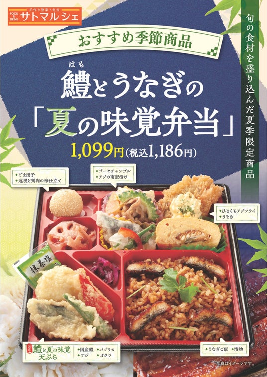 「国産鱧」や夏野菜の天ぷら、「うなぎご飯」「うまき」、「ひとくちアジフライ」「アジの南蛮漬け」、「ゴーヤチャンプル」などの旬の味覚を贅沢に盛り込んだ期間限定商品です。
