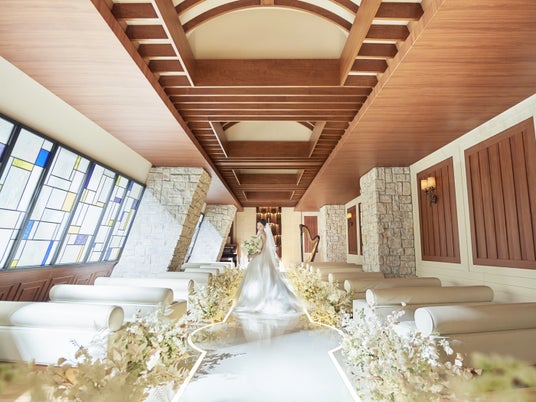 さらに、新コンセプトに「Radiant Wedding Journey」(輝くウエディングの旅)を掲げ、ホテル日航大阪で迎えるウエディングの日が、未来に向かって飛び立つ新郎新婦の旅立ちの起点となるようにとの想いを込めました。ビジュアルもホテルならではの上品さもありながら、ご家族やご友人 とともに過ごす、アットホームな温かさを表現しています。窓からの自然光が映えるチャペルは、エアリーなホワイトコーディネートでやわらかな印象を演出しています。