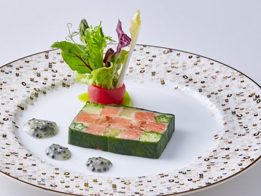 前菜:トラウトと野菜のモザイク仕立て フレンチキャビア添え お祝いのブーケ、またはパテドカンパーニュと茸のマリネ コンソメジュレの輝きジュエリーリング