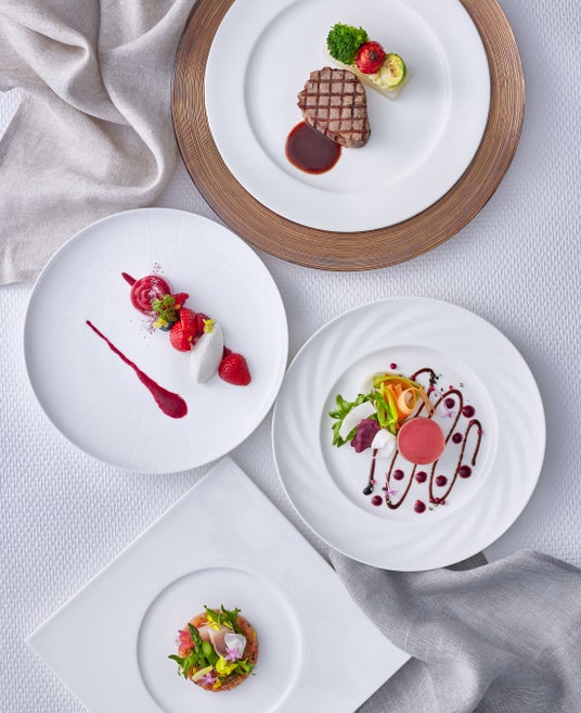 新メニューでは、ホテルならではの伝統的なソースや、厳選した素材の旨味を活かした華やかなコース内容に、お好みでアップグレードメニューを組み合わせることが可能となります。ホテル内フランス料理「レ・セレブリテ」でも人気の牛フィレ肉のステーキ ロッシーニスタイルをはじめとしたラインアップから、おふたりのお好みやご予算に合わせたメニュー作りが叶います。リニューアル記念として、挙式料50%オフなどの特典もご用意します。
