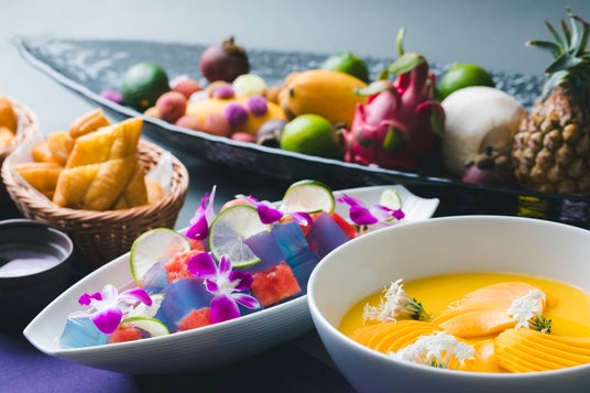 代表的なタイ料理として、「トムヤンクンヌードル」「カオマンガイ」「プーパッポンカリー」などが登場いたします。さらに、タイの伝統菓子の一つである4種のソースで味わえる「パートンコー」、見た目も楽しめる「スイカとバタフライピーゼリー」などもご用意しております。