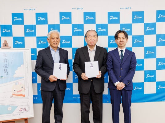 左:和倉温泉観光協会 会長/和倉温泉旅館協同組合 副理事長 多田 邦彦 氏/中央:和倉温泉旅館協同組合 理事長/和倉温泉観光協会 副会長 谷崎 裕 氏/右:株式会社ダイブ 取締役 営業本部長 野方 慎太郎