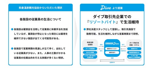 ダイブは、和倉温泉エリアのホテルや旅館で就業する従業員の雇用と生活を守るための仕組みを提供しています。具体的には、就業を希望する従業員を弊社の派遣スタッフとして登録し、取引先企業にて勤務していただきます。これにより、従業員は生活を維持しながら、営業再開までの期間に他施設での研修を受けることができます。