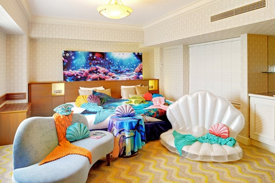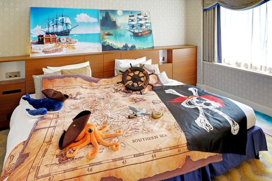 涼しくも心躍る夏を楽しんでいただける「COOL ADVENTURE」では、海底のファンタジーな世界を感じるマーメイドと冒険心を掻き立てるパイレーツといった二つのテーマをご用意しております。本テーマを楽しめる『【Mystery Adventure】マーメイド・パイレーツ』宿泊プランでは、ゆったりとしたジュニアスイートルームに、それぞれの世界観を表現したコンセプトルームを各2部屋、1日4室限定でご用意します。マーメイドルームには、マーメイドの尾ひれを模したブランケットや大きな貝殻があり、まるでマーメイドたちと一緒に海の中で過ごしているようなお部屋を設えました。また、パイレーツルームには、宝の地図や海賊の旗、船の舵などを飾り、海賊船でパイレーツと一緒に冒険をしているような気分を感じられます。それぞれのお部屋の中央には、涼しげで神秘的な空間を演出するプロジェクターライトをご用意しており、海底に佇んでいるかのような波の揺らぎを楽しんでいただけます。