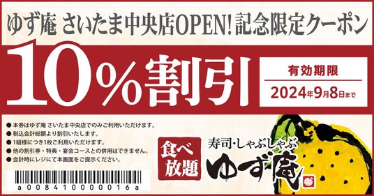株式会社物語コーポレーション(本社:愛知県豊橋市/代表取締役社長:加藤 央之)が、運営する『寿司・しゃぶしゃぶ ゆず庵』は、2024年6月25日(火)に全国97店舗目となる『寿司・しゃぶしゃぶ ゆず庵 さいたま中央店』(埼玉県さいたま市)をグランドオープンいたします。これを記念して、2024年9月8日(日)までご利用いただける『寿司・しゃぶしゃぶ ゆず庵 さいたま中央店』限定のwebクーポンを配布します。