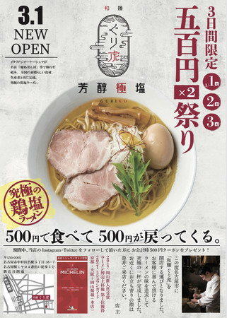 株式会社guriko(本社:岡山県岡山市、代表取締役社長:礒貝 翔)は、「麺処ぐり虎(guriko)」の新コンセプトとして「和麺ぐり虎」を名古屋市に初出店!3月1日にグランドオープンします。「日本の素晴らしい食材、食文化を守り育てる一杯を」コンセプトに。厳選した食材を使用し、魚や鶏の出汁をひいた至高の一杯を。オープン感謝記念として、オープン日3/1(火)~3/3(木)の期間「鶏塩らーめん」【1杯500円】でご提供いたします。※300杯限定また、さらに【当店Twitter、Instagramフォロワー限定】様には【次回ご来店ラーメン500円クーポン券】をプレゼントいたします。 ※来店ときに投稿、ハッシュタグをして頂いたお客様に限る 開催日時:2022年3月1日(火)、2日(水)、3日(木)開催店舗:和麺 ぐり虎(guriko)開催時間:11:00~20:00 ※売り切れ次第閉店