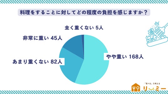 料理に対する負担感が「やや重い」と感じる人が半数以上を占め、多くの人が日常の料理を時間や労力の面で大きな負担に。