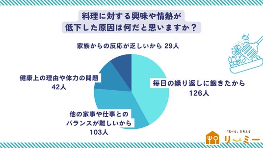 料理に対する興味や情熱が低下している主な理由として、「毎日の繰り返しに飽きた」という声が多く、料理の日常が多少単調に感じられることが原因のようです。これは料理に新鮮さや創造性を加えることの重要性を強調しています。