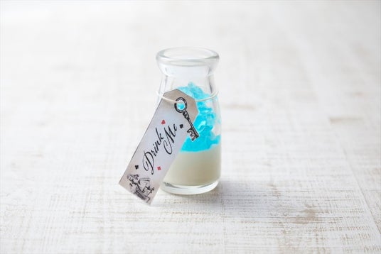 アリスのように飲むと体が小さくなってしまうかも?! 物語に登場する「Drink Me」と書かれた札のついた、瓶入りの不思議な飲みものをイメージしたデザートです。