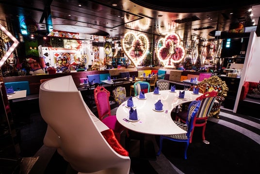 このメインフロアを中心に、大きな大きなトランプに囲まれるソファー席やハートの女王様ご自慢の庭を模したテーブル席など、不思議の国のアリスのパラレルワールドを彷彿とさせる幻想的な空間が広がります。