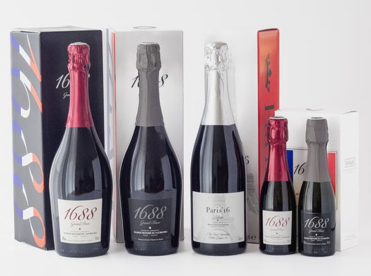 商品名(容量)/市場価格】左から、1688グラン・ロゼ (750ml)/ 5,098円(税込)、1688グラン・ブラン (750ml) / 5,098円(税込)、Paris’16ブラン/ 3,726円(税込)、1688 ペアセット(各200ml)/ 3,726円(税込)