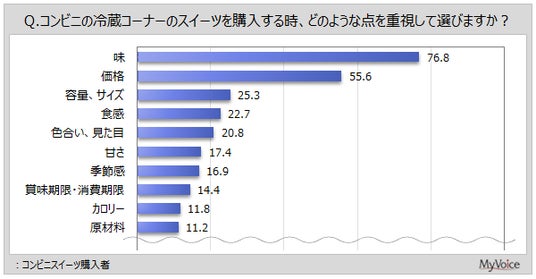 コンビニスイーツ購入時の重視点は(複数回答)、「味」が購入者の76.8%、「価格」が55.6%、「容量、サイズ」「食感」「色合い・見た目」が各20%台です。