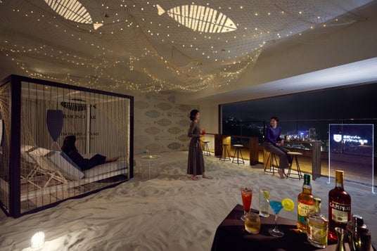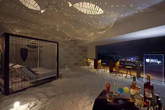 ホテル最上階にある「ソラノビーチ Books&Cafe」 を、干物のフォルムや網をモチーフにした装飾でスタイリッシュな Bar 空間に設えます。メイン空間のカバナ席は、網で囲み、干物のオブジェを設えたデザインです。天井には網の装飾と干物型のライティングを施しており、ゆったりとくつろぎながら、干物を目で楽しめます。また、窓側にはハイテーブルとハイチェアを設置し、熱海の夜景を眺めながら干物とお酒を楽しめる、落ち着いた空間です。