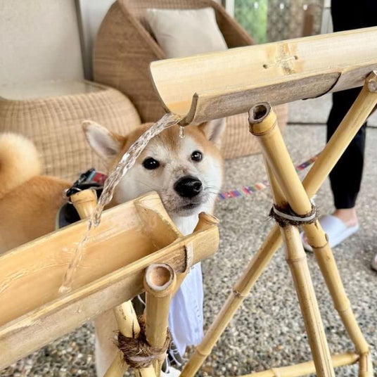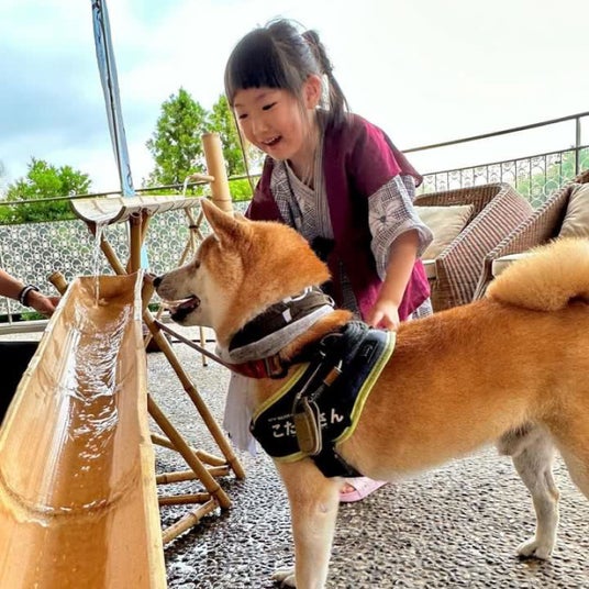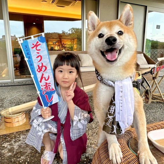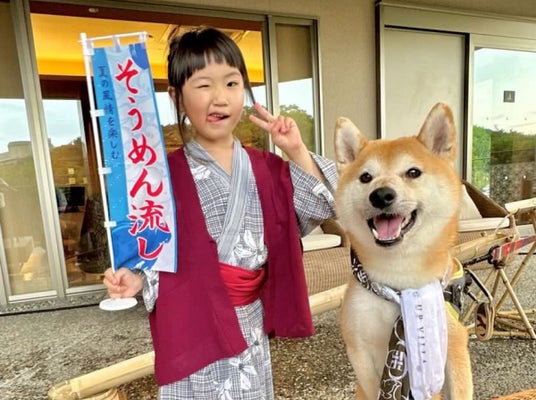「愛犬流しそうめん」を仲良く楽しむももこちゃんと虎太朗くん