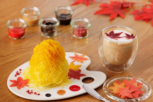 「紅葉モンブラン」は、自分でペイントしてデコレーションができるスイーツです。パレットモチーフのお皿に紅葉カラーのモンブランを絞って、秋らしい赤、黄、茶色などのソースと、栗ペーストで作られたまるで本物のような紅葉チップスを自由にトッピングして楽しめます!
