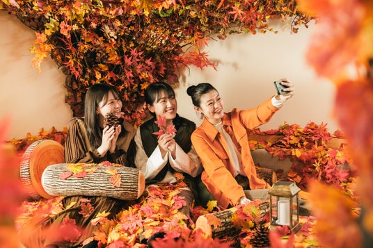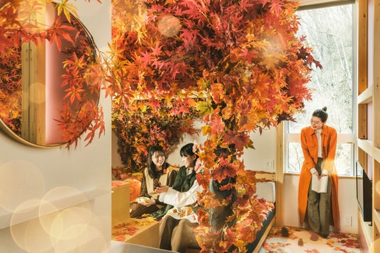 1万枚以上の紅葉をふんだんに設えた、紅葉まみれのお部屋を用意します。今年はソファーのスペースに紅葉の木を設え、よりボリュームを増しました。二段構造になっているヤグラ寝台の1階のソファや2階のベッド部分には、まるで色鮮やかな絨毯のようにもみじが広がっており、仲間と思いっきりばらまいて写真や動画を撮るもよし!もみじの上に寝転がって、のんびり夜通しおしゃべりするもよし!室内でも紅葉を存分に楽しむことができます。天候に左右されず、いつどこからでも素敵な写真が撮れるので、みんなと一緒に撮影会をするのもおすすめです。