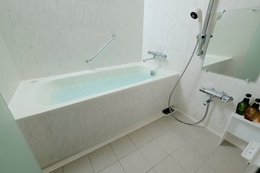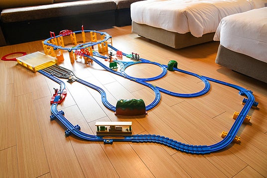 4名様までご利用いただけるファミリールームで貸出し用のプラレールセット(車両・レール・情景)を、レイアウト例を参考にして走らせたり、色々な工夫でレイアウトしたりと、楽しさいっぱいです。プラレール好きのお子様と一緒にご家族でお楽しみいただける至福の1泊2日です。客室は靴を脱いで過ごすフローリング床なので、プラレールを広げて遊びやすい設計。トイレと別々の独立型バスルームは洗い場付きで、ジェットバス機能も搭載しているので、ゆったりとおくつろぎいただけます。