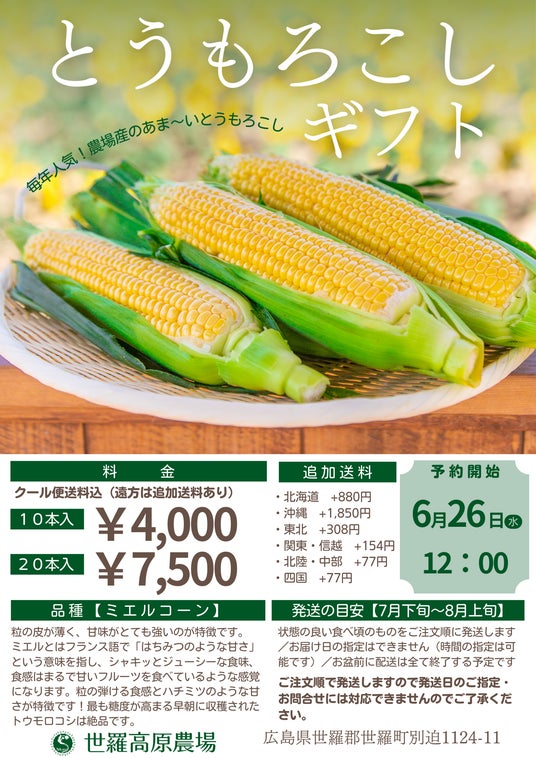 毎年人気の世羅高原農場産の採れたてとうもろこしを2024年も販売します。採れたての甘いとうもろこしをご自宅に、贈り物にお買い求めください。ご予約を受付け、7月下旬~8月上旬に収穫しお届けします。
