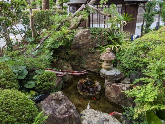綺麗な日本庭園の真ん中には池があり、錦鯉を見ることができます。古民家の昔懐かしい空間とお亀堂の甘味でほっと一息。ゆっくりとした時間をお過ごしいただければと思います。