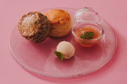 定番のミルクと、アールグレイ&白桃を混ぜ込んで焼き上げた2種類のスコーン。ピーチジャムとクロテッドクリームをお好みで。