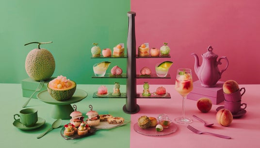 初めにゲストをお迎えするウェルカムドリンクは、見た目も味も「桃」を存分に堪能できる「ピーチスムージー」。続くウェルカムデセールには、フレッシュの国産メロンを半玉使用した、「メロンと桃のパルフェ」をご用意しました。どちらもひんやりとした喉ごしとジューシーな果実の甘さで、心地よい涼をお届けします。スタンドスイーツには、桃をかたどった愛らしいフォルムの「桃ブッセ」や、フレッシュの赤肉メロンと軽やかな生クリームが調和する「メロンショートケーキ」など、夏の宝石箱を思わせるエレガントかつ乙女心をくすぐる7種類をスタンバイ。さらに、白桃入りのアールグレイスコーンや、「桃と生ハムのサンド」をはじめとする3品のセイボリーも取り揃え、旬のフルーツを心行くまで満喫いただけるパティシエ渾身の新作アフタヌーンティーです。そのほか、燻製和紅茶や日本伝統茶を含む20種類以上のドリンクを、120分間のフリーフローでご利用いただけます。