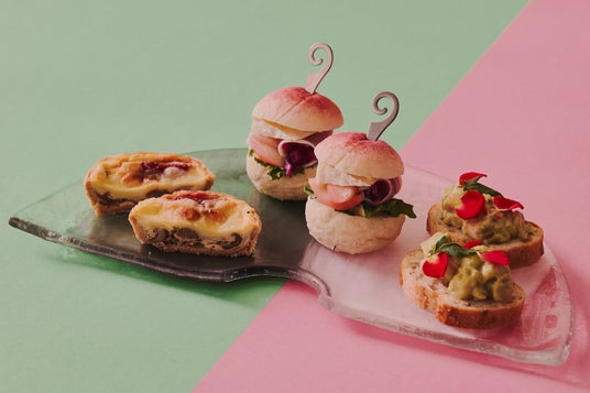 (左から)イチジクとモッツアレラチーズのキッシュ、桃と生ハムのサンド、海老とメロンのワカモレカナッペ