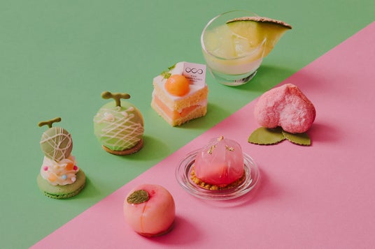 (右上から)グラスメロン、メロンショートケーキ、メロンムース、メロンマカロン、桃ブッセ、桃の寒天ゼリー、黄桃ムース