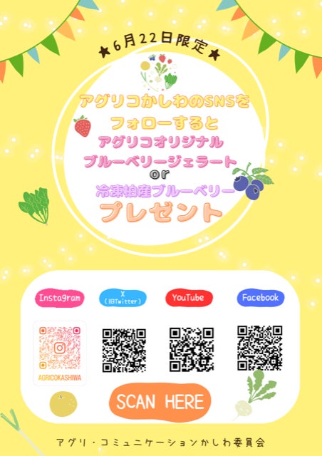 アグリ・コミュニケーションかしわ委員会の以下の4つの中から1つSNSをフォローすると、アグリコオリジナルのブルーベリージェラートまたは冷凍の柏産ブルーベリーをプレゼント!(アグリコオリジナルのブルーベリージェラートは先着100名様のため、お早めに!)