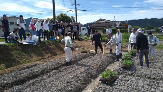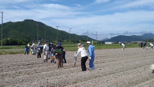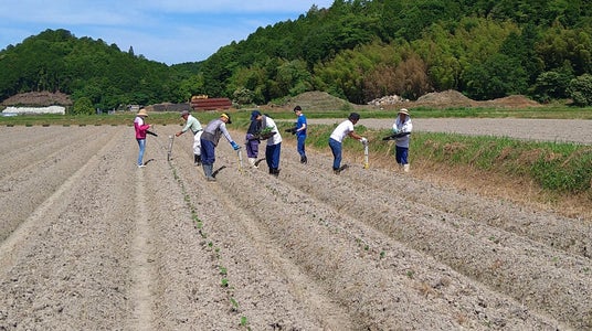 農事組合法人いずみ営農組合(事業所:兵庫県丹波篠山市泉1089-1、組合長:小嶋美則、以下「いずみ営農組合」)は、6月15日(土)、兵庫県丹波篠山市泉にて、老舗黒豆専門店の株式会社小田垣商店(本社:〒669-2323 兵庫県丹波篠山市立町9番地、代表:小田垣 昇、以下「小田垣商店」)、ANAグループ労働組合連合会(事務局:東京都大田区羽田空港3-3-2、会長:白石 哲也、以下「ANAグループ」)と連携し、丹波篠山黒枝豆の植付けを行いました。