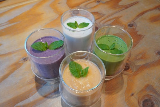 クラッシュゼリーとミルクだけで作った、苦みが少なくスイーツのようなアイスラテ。色鮮やかな花火をイメージした、果物と野菜をふんだんに使った色とりどりのスムージー(ブルーベリー&アサイー、バナナ、緑野菜、オレンジ)もおすすめ。
