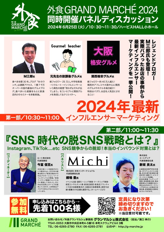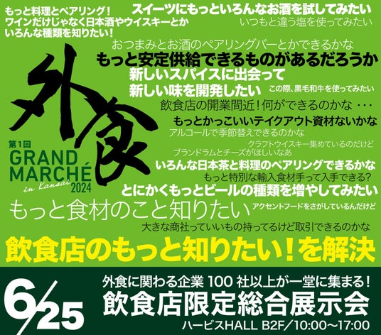 2024年6月25日(火)、グランマルシェ株式会社(本社:大阪市中央区本町4-5番16 本町スクウェアビルII 3階、代表取締役:清水 浩夫)は、飲食店様向け総合展示会、「外食GRAND MARCHE2024」を開催いたします。本展示会を通じて、飲食店経営者様、従事者様、開業予定者様の悩み解決のサポートをします。