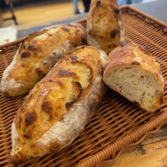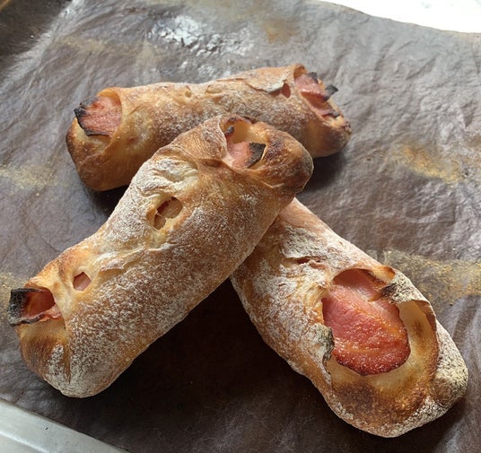 ファーイーストバザールのハリッサを使用し、フライドオニオン、ベーコン、チーズの入ったフランスパン。