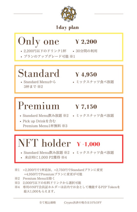 これらのニーズにお応えするため、新プラン「Only one」の導入と、お昼の時間帯は「CryptoCafe P2P」としての営業を開始することといたしました。