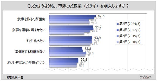 お惣菜を購入する場面は(複数回答)、「食事を作るのが面倒」「食事を簡単に済ませたい」「すぐに食べたい」が購入者の各40%台、「準備をする時間がない」が33.8%です。
