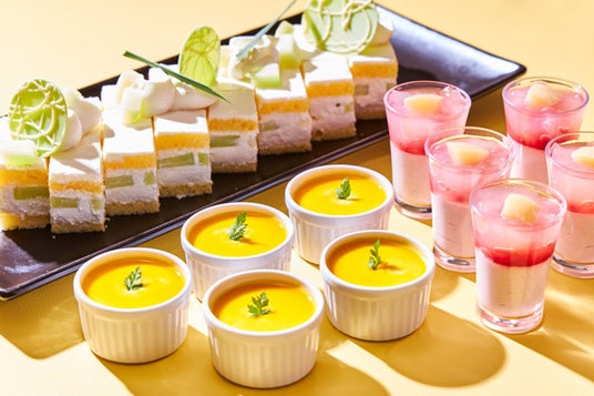 日本料理・西洋料理・中国料理・スイーツの各専門シェフが腕を振るうお料理の数々をお届けします。たんぱく質が豊富で良質な脂質がとれるメカジキを焼いてフレークにしたものと、滑らかでクリーミーなアボカドを合わせた“メカジキフュメとワカモレ”。夏にふさわしく彩り鮮やかな見た目が食欲をそそります。“サーモンのケイジャンスパイスロースト ケッパーオリーブソース”は、スパイシーな味わいがクセになるケイジャンスパイスとサーモンを一緒にローストすることで適度な辛みが生まれ、食欲をかき立てる一品です。プリッとした食感を楽しめる”海老のフリット“や、衣はサクッと、中はとろりとした食感がたまらない”アボカドのフリット“、魚介類をにんにく、オイル、トマトソースで仕上げた”スパゲティーニ ペスカトーレ“など、思わずお酒が進むメニューも。冷えたビールや特製カクテルなどと合わせてお楽しみください。疲労回復効果が高い豚肉を使った“豚トロのにんにく香味焼き”や、ヘルシーながら栄養価が高い仔羊のお肉を使った“仔羊のチリンドロン”もおすすめです。スタミナ食材と言われるにらを使った”焼きにら饅頭“は、労回復に最適です。ディナータイム限定では、初夏から夏に旬を迎える、栄養価が高く滋養強壮に効果がある脂がのった旬の“穴子”を揚げたての天麩羅でご用意いたします。その時々におすすめの夏野菜の天麩羅も合わせてご賞味ください。夏が旬のメロンや桃、マンゴーを使った、さっぱりとしつつもフルーツの甘さをしっかり味わえるスイーツもお楽しみください。