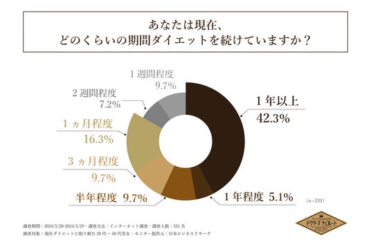 まず「現在、どのくらいの期間ダイエットを続けているか」を問う設問への回答で最も多かったのは「1年以上」で42.3%となりました。この結果から、1年以上の長期に渡ってダイエットに取り組んでいる方が比較的多いと明らかになりました。