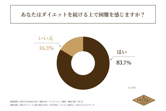 また、「ダイエットを続ける上で困難を感じるか」を尋ねる設問では「はい」と回答された方が83.7%を占め、5人中4人以上の方がダイエットを継続する上で何らかの困難さを感じていることがわかりました。