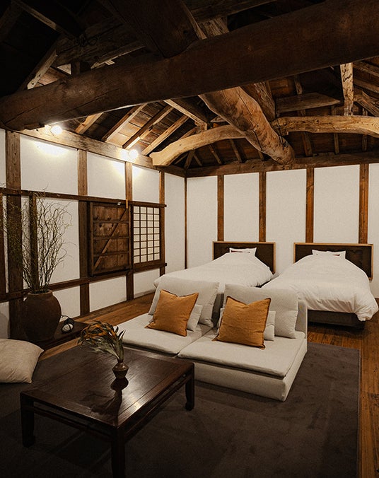 赤城宿の中で最も大きな施設となる「珠蕾山荘」は、307平方メートル の広大な平屋建築。蕾の間(145平方メートル )と華の間(162平方メートル )2つの間を有し、1日2組限定で贅沢な滞在を提供します。通常は2つの玄関に分かれますが、2つの間を繋げた最大収容人員は12名。お友達グループや企業の研修など、プライベートを確保しつつ共有スペースに集まって楽しむことも可能です。サウナやホームシアターを備え、美しく静かな環境で特別なひとときをお過ごし頂けます。