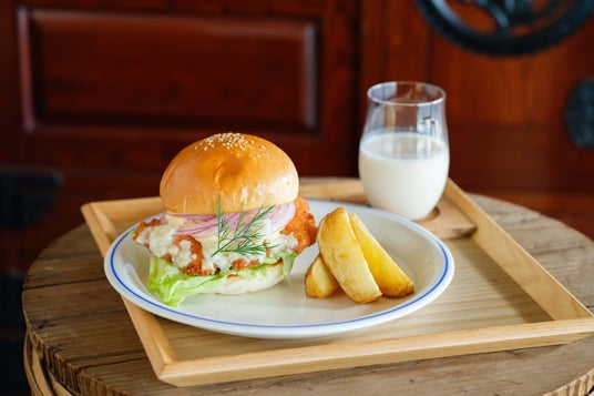 糀バーガー(サーモンフライ レモン塩糀)、どぶろく(店内ドリンクから選択)のセット 1,800円((C)ヤマト醤油味噌)