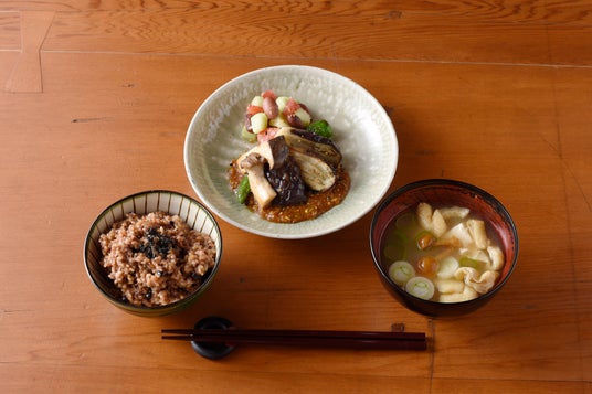 寝かせ玄米(R)と具沢山みそ汁、主菜1品からなる基本形((C)ヤマト醤油味噌)