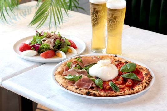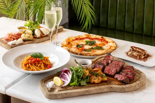 コースには、前菜のアンティパストミスト、パスタまたはピッツァ、地元産牛肉3種のグリルミスト、ドルチェ、食後の飲み物が含まれます。