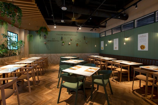 イータリー湘南店のレストラン「LA PASTA e LA PIZZA」。少人数から大人数まで対応可能なテーブルレイアウトです。